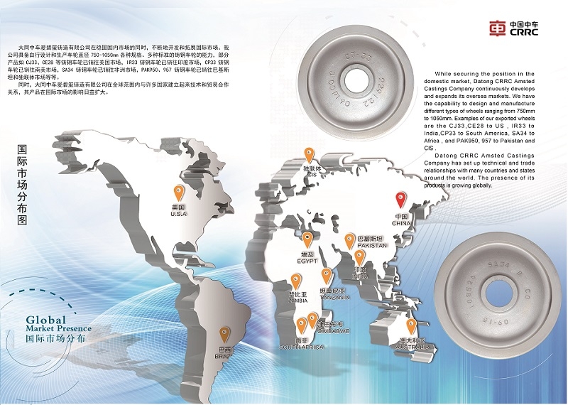 大同中车爱碧玺铸造有限公司在稳固国内市场的同时,不断地开发和拓展国际市场,我公司具备自行设计和生产车轮直径750~1050mm各种规格,各种标准的铸钢车轮的能力,部分产品如CJ33,CE28等铸钢车轮产品已进入美国市场,IR33铸钢车轮进入印度市场,CP33铸钢车轮进入南美市场,SA34铸钢车轮已销往非洲市场 污污污视频在线观看,PAK950,957铸钢车轮已销往巴基斯坦和独联体市场。