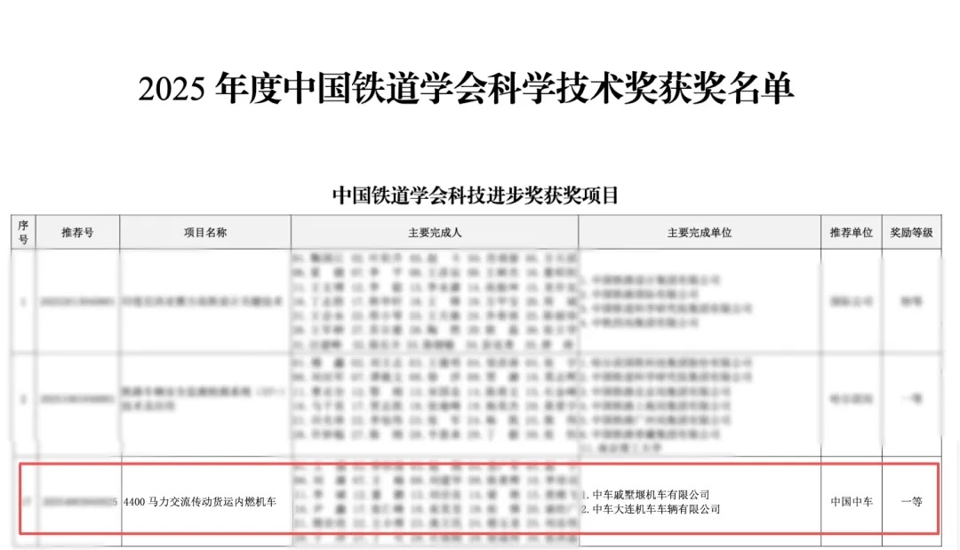 On January 8, the China Railway Society announced the winners of its 2025 Science and Technology Awards. The project “4,400-Horsepower AC Transmission Freight Diesel Locomotive”, submitted by CRRC Qishuyan Co. , Ltd 污污污视频在线观看. , received the First Prize of the 2025 China Railway Society Science and Technology Award.