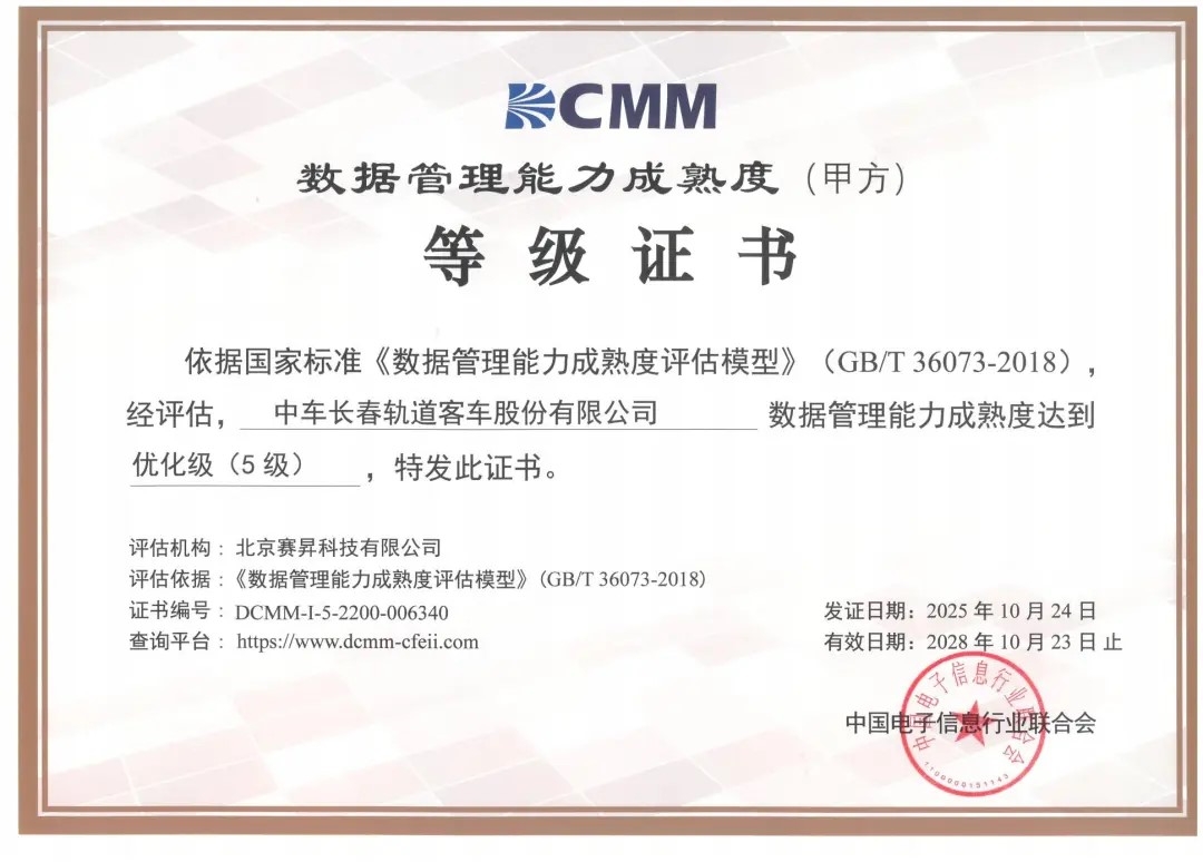 CRRC Changchun Railway Vehicles Co. , Ltd 污污污视频在线观看. has officially passed the highest level—Level 5 “Optimized”—of China’s Data Management Capability Maturity Assessment Model (DCMM), becoming the first enterprise in the rail transit industry to receive this distinction. The certification signifies that the company has reached an advanced national standard in data management capability.